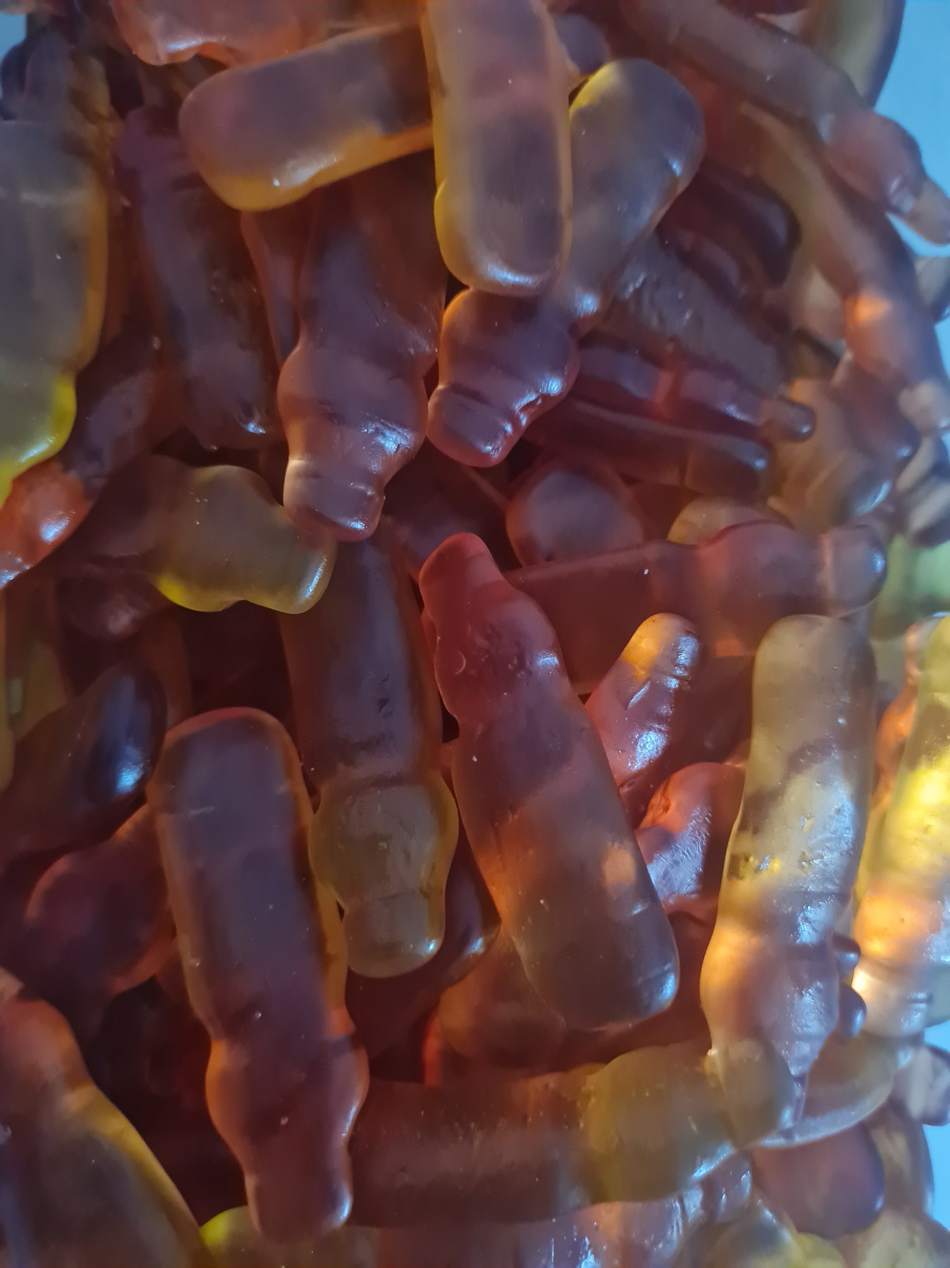 Ingrédients : Sirop de glucose ; Sucre; Gélatine; Dextrose; Acidifiant : acide citrique ; Huile de tournesol; Sirop de caramel; Concentrés de fruits et de plantes : carotte, pomme, poivron, tomate, hibiscus ; Arôme; Agent d'enrobage : cire d'abeille blanche et jaune