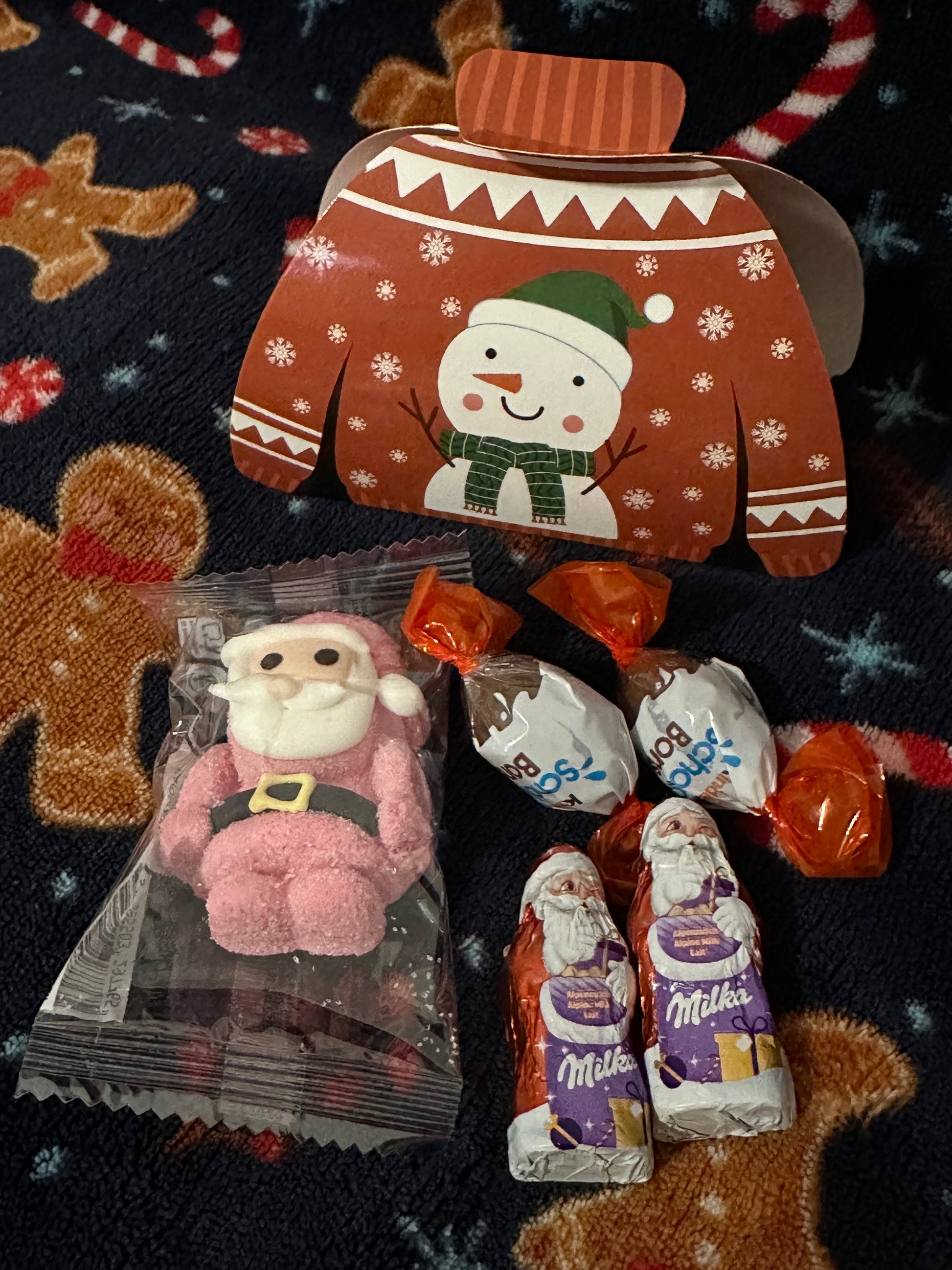 elle contient 2 schokobons , 2 mini Pere Noël Milka et 1 chamallow de Noël