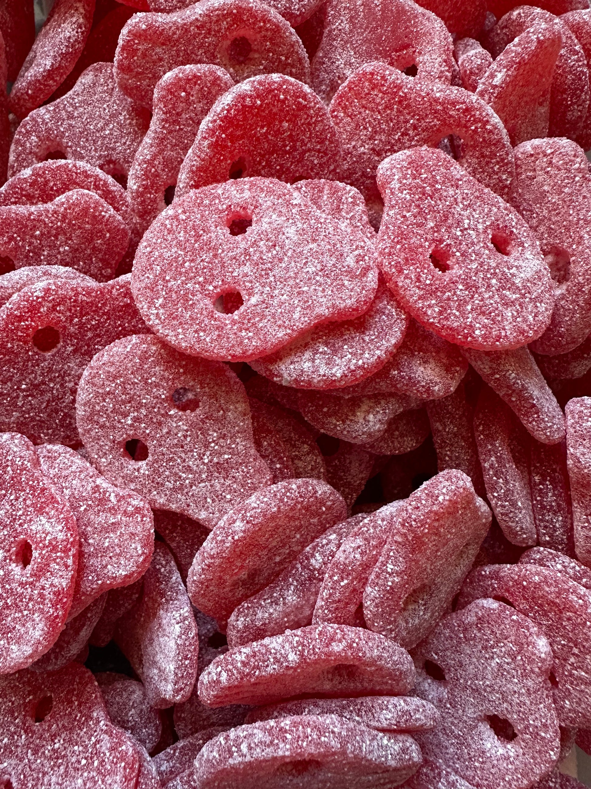 Ingrédients : Sucre, sirop de glucose, eau, amidon de pomme de terre modifié, 5 % de jus de fruits à partir de concentré (pomme, poire, ananas, pêche), régulateurs d'acidité (E270, E296, E330, E350), arômes naturels, colorants naturels : concentré de carotte et concentré de patate douce. (suédois)