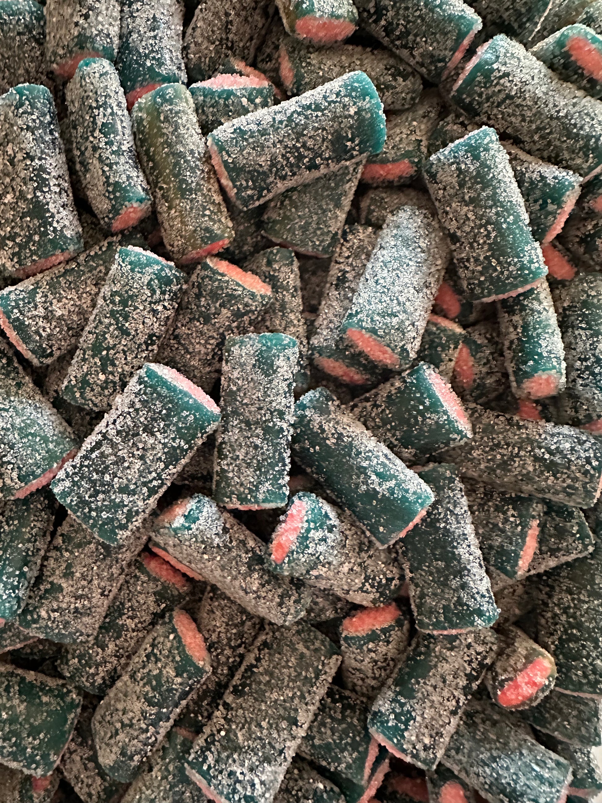 Ingrédients: sirop de glucose-fructose, sucre, farine de blé, amidon, huile et graisse végétale (palme), eau, acidifiant (e330), amidon de pomme de terre, sirop de sorbitol, gélatine de boeuf halal, arômes, antioxydant (E331iii), émulsifiant (E471), colorants (E171, E133, E129), agents d'enrobage, huile végétale (palme et noix de coco).