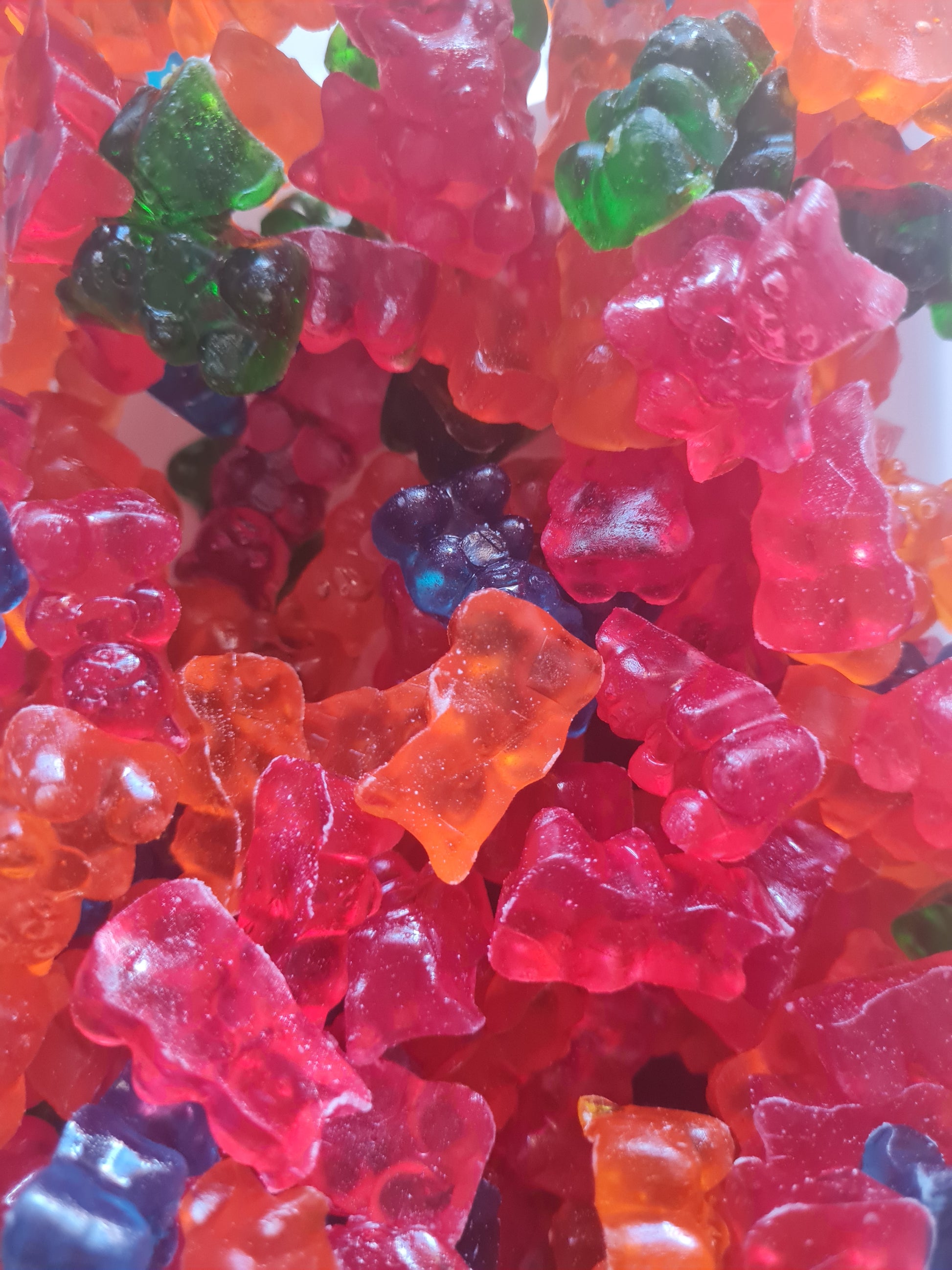 Ingrédients : Maltitols, eau, gélatine, acide citrique, pectine, arômes de fraise, pomme, baies, orange, colorants : rouge carmin, bleu patenté V, tartrazine, jaune soleil FCF, ponceau 4R, bleu brillant FCF, et agent d'enrobage : cire de carnauba.